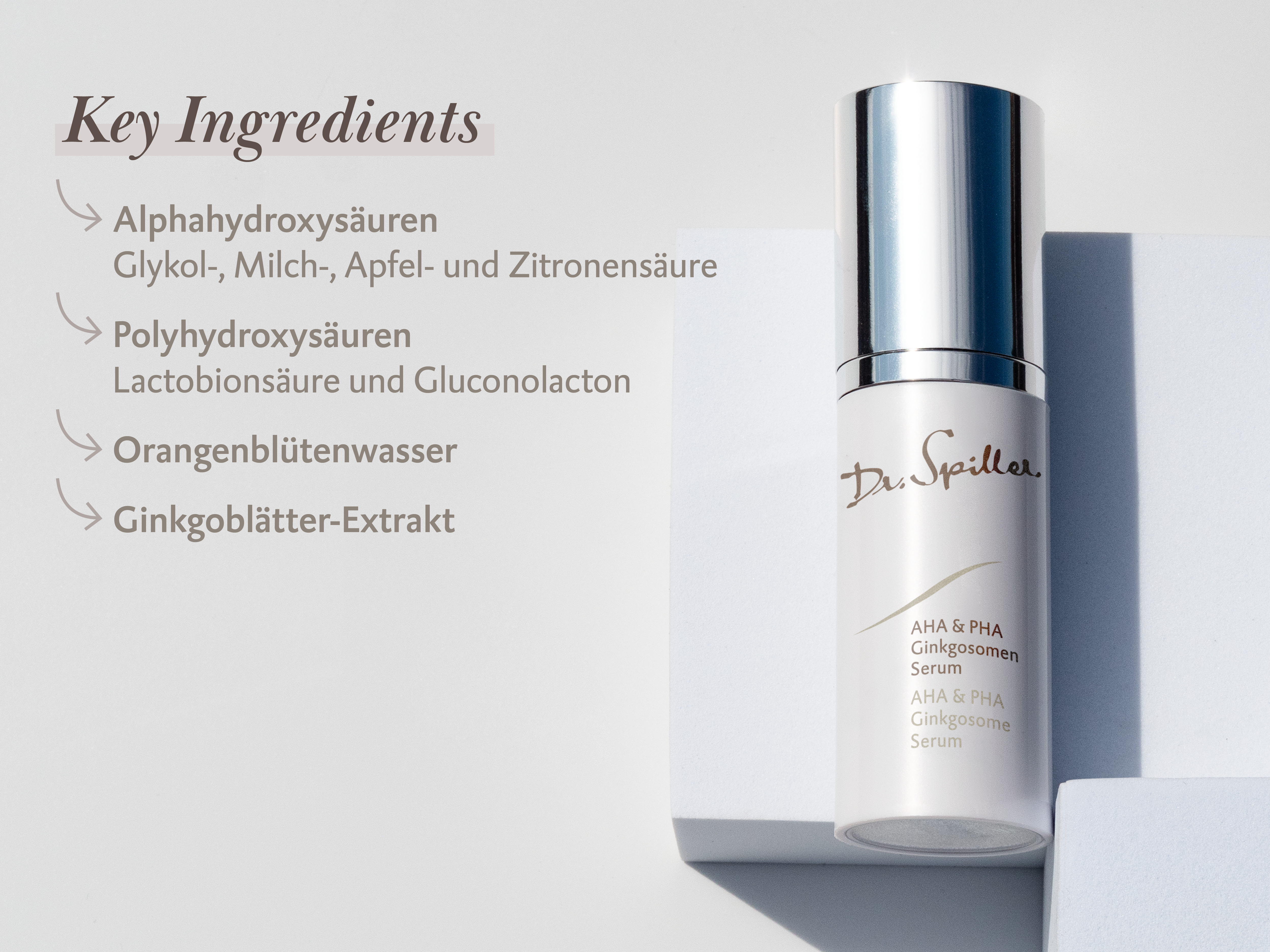 The AHA & PHA Ginkgosome Serum contains a highly effective yet gentle combination of deeply penetrating low-molecular alpha hydroxy acids such as glycolic, lactic, malic, and citric acids, as well as mild high-molecular polyhydroxy acids such as lactobionic acid and gluconolactone. The effect: particularly effective yet gentle exfoliation and acceleration of skin renewal processes. The skin-friendly pH value of 3 supports the optimal effect of the acids contained in the serum. Ginkgo leaf extract also stimulates microcirculation and skin metabolism and, thanks to its antioxidant effect, combats free radicals that accelerate skin aging. Fine orange blossom water has a soothing effect.
