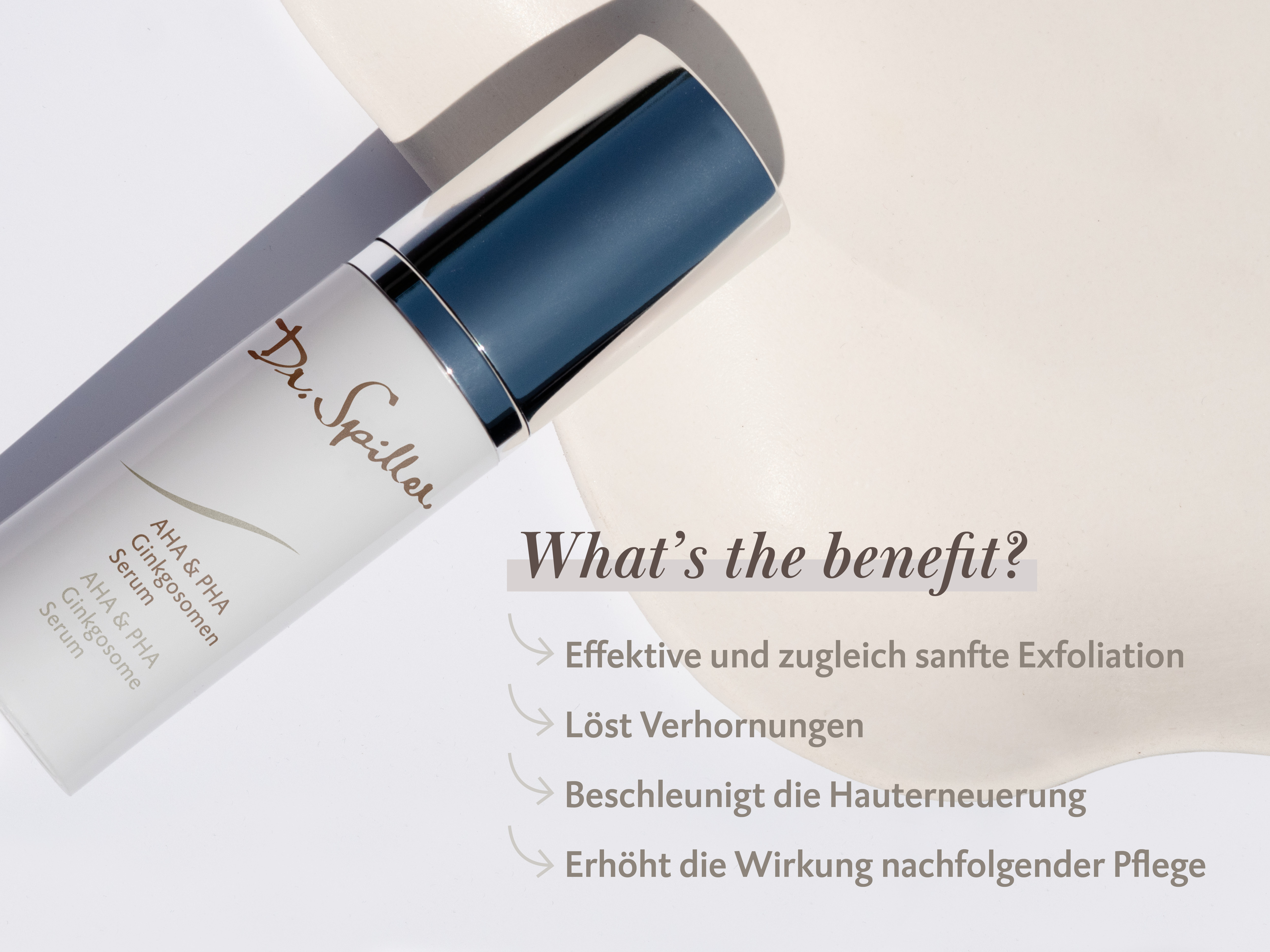 The lipid-free AHA & PHA Ginkgosome Serum is suitable for all skin types, but especially for tired, dull skin and uneven skin texture – it can even achieve amazing results on scarring, such as that often caused by acne. Sensitive skin can also benefit from its exfoliating properties, but it is recommended to start with a lower frequency of application and gradually increase it. With regular use, the intensive serum skillfully stimulates skin renewal. As a result, skin elasticity improves, wrinkles appear softened, pigmentation appears lighter, pores are refined, and blemishes and irregularities are visibly reduced. The complexion appears fresher and clearer overall. In addition, the skin becomes more robust, resilient, and firmer, and its moisture balance improves noticeably.