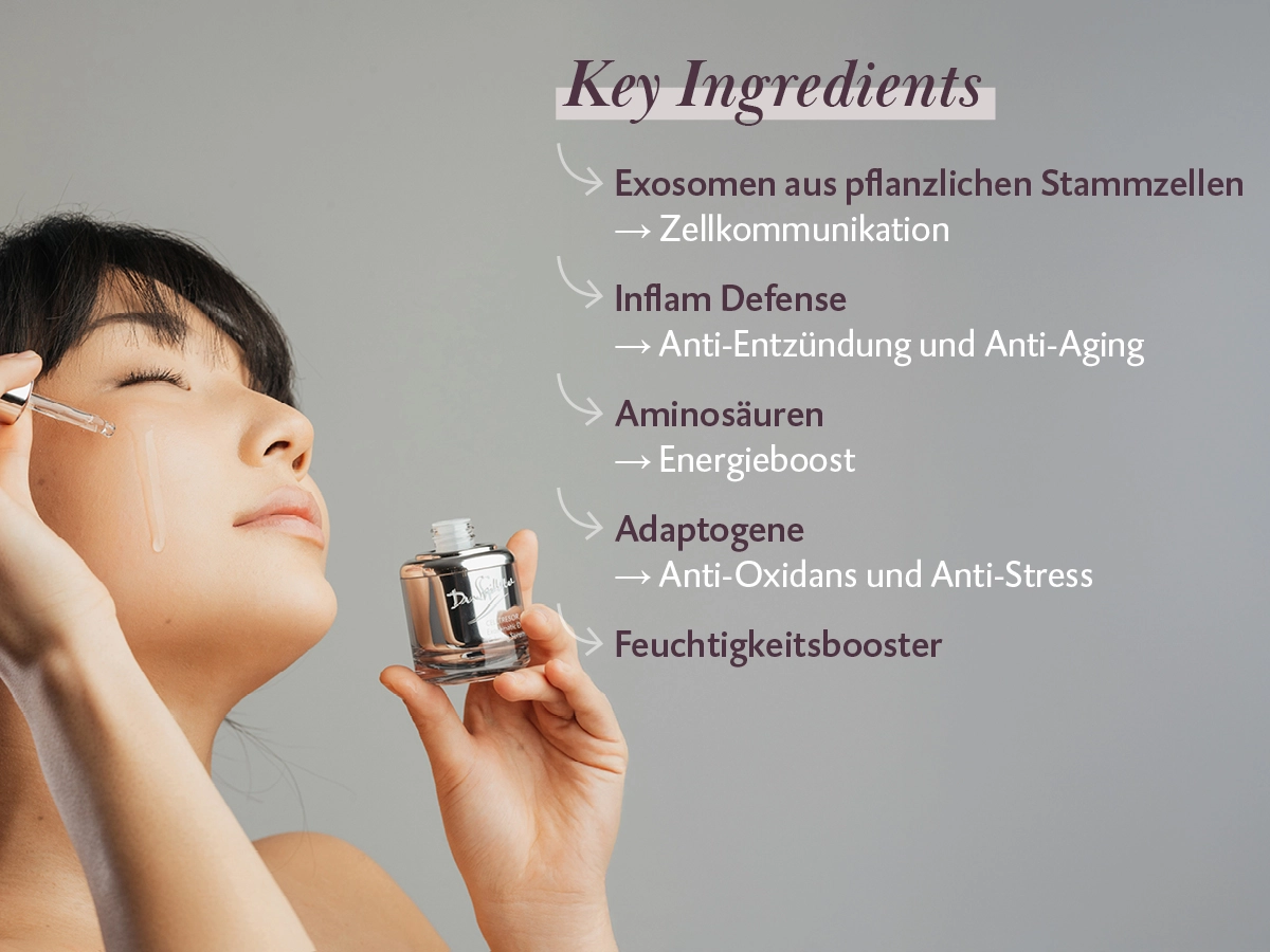 The plant-based active ingredient InflamDefense specifically targets “inflammaging”—chronic inflammatory processes that weaken the skin's protective barrier and cause premature, visible skin aging. InflamDefense lastingly raises the irritation threshold of sensitive skin, boosts collagen synthesis and visibly improves skin elasticity and firmness. Additional complementary active ingredients complete the deep-acting anti-aging effect of Exosomatic Deep Calming Serum. Adaptogens support the skin’s ability to defend against stressors and regain balance, while adenosine boosts cell energy, strengthens the skin's support scaffold and firms facial contours. Glutathione, a true super-antioxidant, acts in conjunction with essential amino acids to counteract oxidative stress, promote cell health and refresh the skin’s radiance. The combination of hyaluronic acid and a biopolymer significantly boosts the skin’s moisture levels. These ingredients deeply hydrate the skin, replenish moisture reserves, and ensure a plump, radiant complexion.